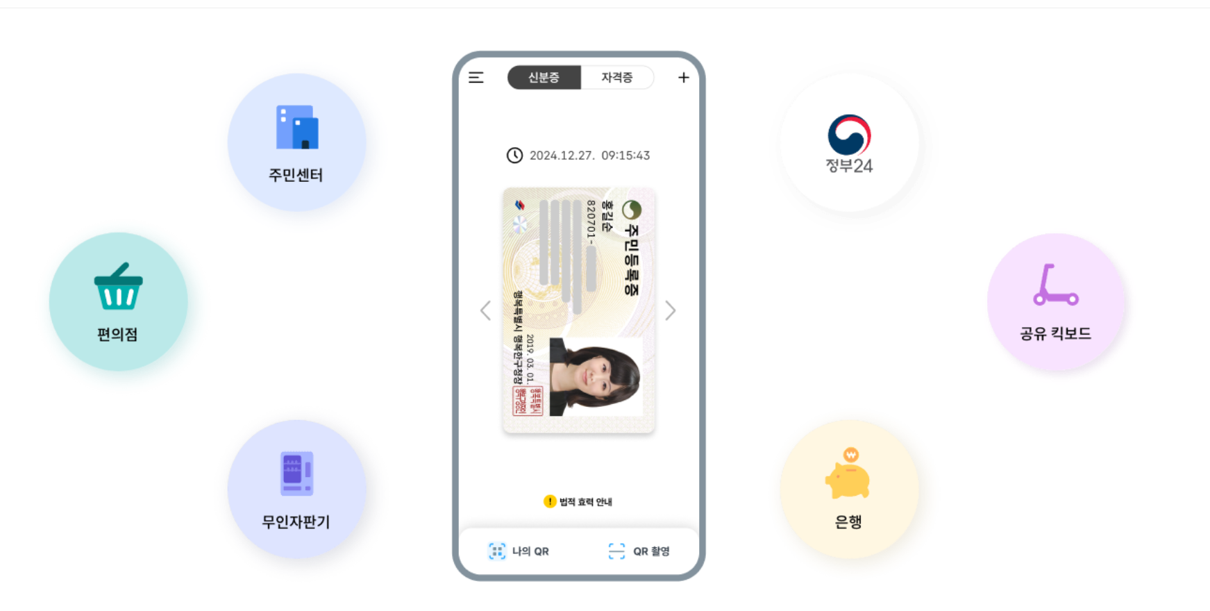 주민등록증, 운전면허증, 외국인등록증, 국가보훈등록증 등을 디지털 형태로 발급받아 사용할 수 있으며, 실물 신분증과 동일한 법적 효력을 갖고 있습니다.