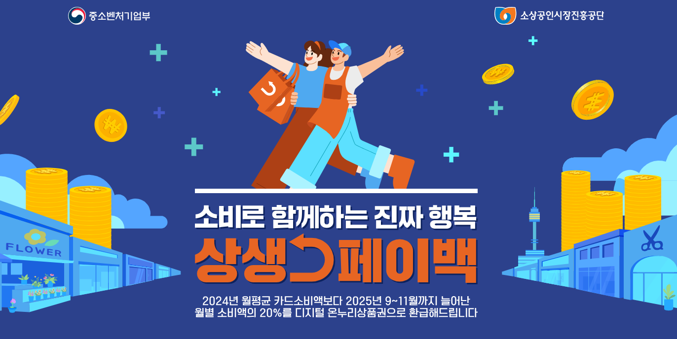 정부가 내수 활성화와 소상공인 매출 회복을 위해 상생페이백 사업을 본격 시행합니다. 2024년 월평균 카드소비액보다 2025년 9~11월 소비가 늘어난 금액의 20%를 디지털 온누리상품권으로 돌려받을 수 있는 제도입니다.
