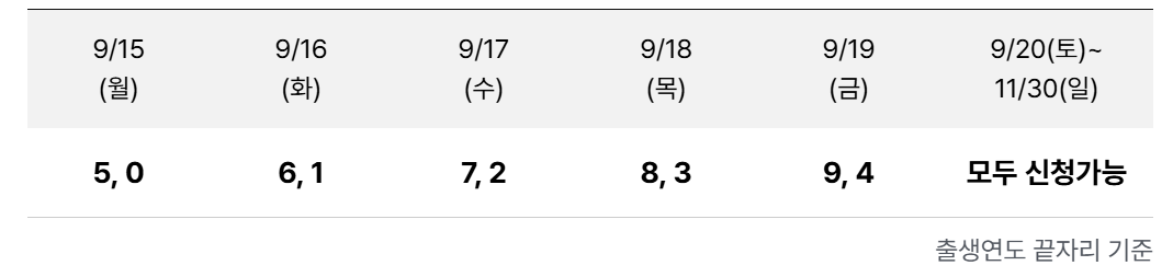 신청은 단 한 번만 해도 3개월 전체 실적에 대해 자동 반영 (단, 첫 주는 출생연도 끝자리 5부제 운영(예: 5·0 → 9월 15일 신청)