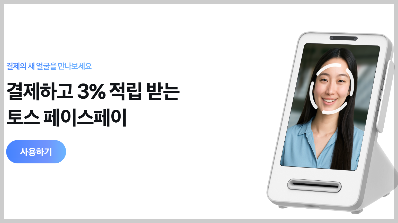 토스 앱에서 얼굴과 결제 수단을 등록하면, 매장 내 단말기에 얼굴을 보여주는 것만으로 1초 내 결제가 완료됩니다. 등록 절차는 3분 내외로 간단하며, 결제 내역은 앱에서 즉시 확인 가능합니다.