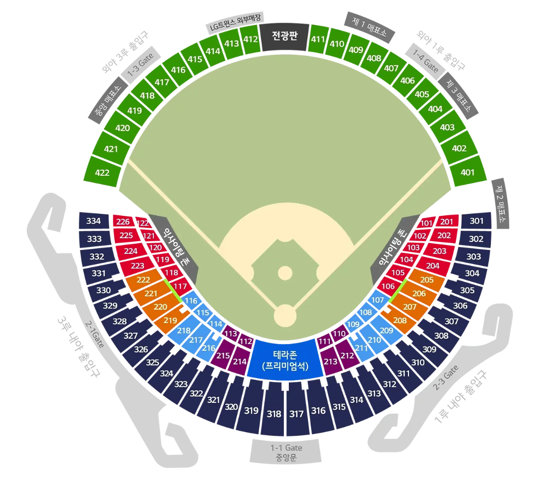 - 좌측 외야(401~422 블록)와 우측 외야(411~420 블록) 초록색 구역이 응원석입니다.