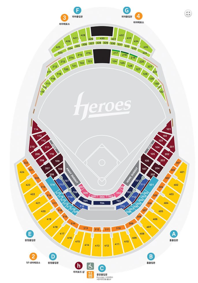 - 고척: 중앙석 하단, 3루 내야석 상단, 응원석 구역